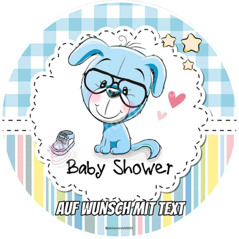 This cake topper with a blue dog with glasses and the words "Baby Shower" is an ideal gift for a baby shower or as a surprise for your little ones. You can add a personal text of your choice as a highlight. You can serve the topper on cakes, pies and cupcakes. Present your home-baked goods with this personal cake image and enjoy the surprised faces of your loved ones.